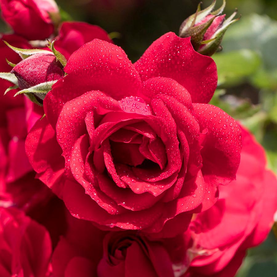‘Satchmo’ — это фейерверк красного цвета! Этот сорт флорибунды обладает удивительной энергией и выразительностью. Его яркие, огненно-красные цветы с глянцевыми лепестками буквально светятся на фоне тёмной листвы. Цветки среднего размера, собраны в крупные соцветия, которые обильно покрывают весь куст.