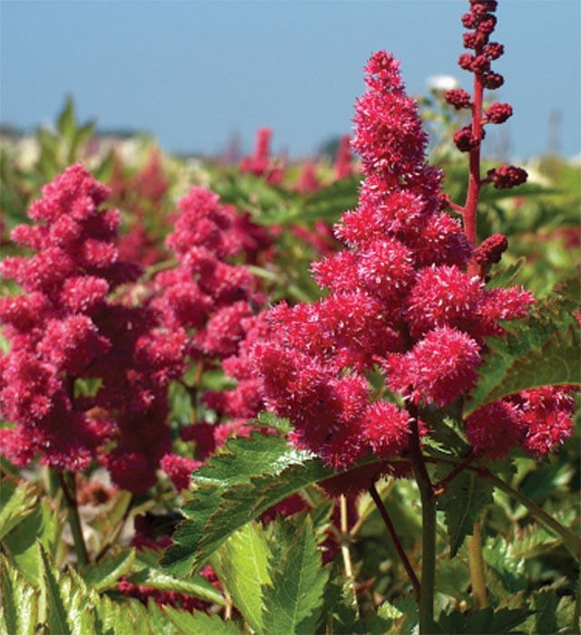 Багаторічна трав'яниста рослина. Густо покритий листям кущ з темно-зеленим листям. Висота рослини 40-50см. Квітки карміново-червоні. Цвіте в липні. Астильба відрізняється високою зимостійкістю, практично не уражається хворобами і шкідниками. Може рости в місцях з досить високими грунтовими водами і переносить навіть застій води, а ось довгострокову посуху астильба не перенесе. Бідний грунт, відкритий сонцепік і відсутність дощів можуть погубити рослину. Посадка групою прикрасить квітник будь-якого стилю в тіні хвойних або листяних дерев, тим більше, що рослини добре себе почувають в загущеній посадці. Відмінно доповнить міксбордер біля фонтану або водойми. Традиційні сусіди астильби - хости, папороті.