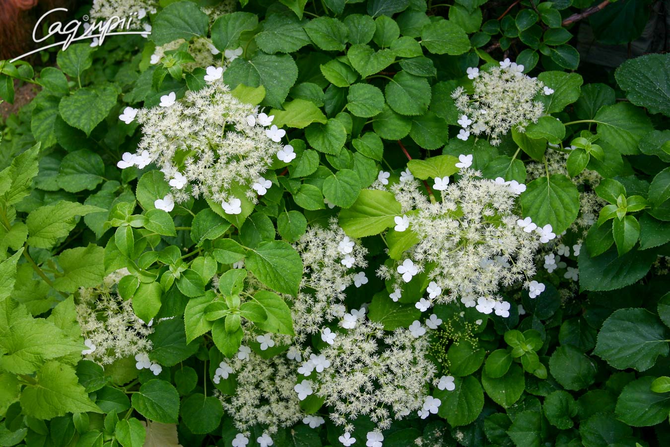 Повзучий чагарник, стелеться по землі, густий, утворює куртини або підіймається по деревах і стінах, злегка в'ється завдяки корінню-присоскам, в молодості росте повільно. На деревах і стінах досягає висотою до 10-15 м. Висаджений поодиноко, утворює густі, висотою до 1,5 м кущі. Плоскі, білі зонтичні суцвіття шириною до 25 см, по краях розташовані сніжно-білі солодкувато пахнуть квітки. Цвіте з червня по липень. Листки листопадні, овальні, довжиною 6-10 см, зверху блискучі, темно-зелені, знизу світліше, трохи шкірясті, жирні, дуже довгий держак (до 15 см); осіннє забарвлення жовте. Віддає перевагу вологим, гумусним, проникним, родючим, кислим або нейтральним ґрунтам, слід уникати вапняних. Переносить кореневий тиск, але не ущільнення грунту. Віддає перевагу злегка притінені місця. Вимагає високої вологості повітря, переносить радикальну обрізку до старої деревини. Морозостійкий, але в суворі зими може підмерзати. Використовують для озеленення пергол, стін, дерев і на опорах, а також як солітер.