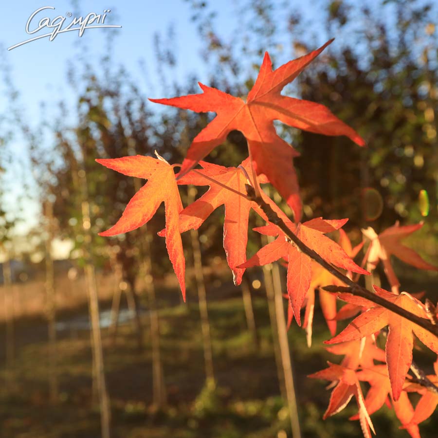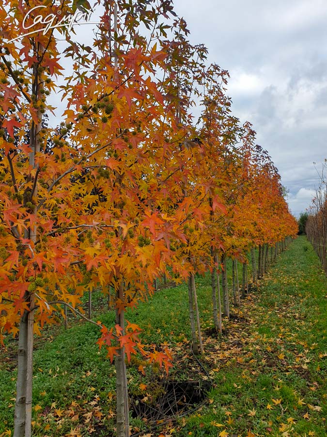Бажання оновити сад чи додати чогось незвичайного? Будь ласка, Ліквідамбар смолоносний 'Worplesdon', неймовірно гарне, перспективне, надзвичайно стійке дерево. Окрім назви Ліквідамбар смолоносний, він ще має назви: амброве або бальзамічне дерево. Висота його 12-15 метрів, а ширина 6-12 м. Крона змінюється, у молодому віці вона компактна з висхідним, прямим стовбуром. У зрілому віці крона стає широко-пірамідальною, бо гілки розростаються і формують щільну, правильну форму дерева. Головними прикрасами Ліквідамбара є його листя та плоди. Блискучі, шкірясті, пальчато-лопатеві листочки, схожі на кленові, тільки менші. Листочки розміром від 10 до 18 см, мають насичено зелений колір, що восени здивує неймовірно яскравим поєднанням кольорів на одному дереві від жовто-помаранчевого до червоного. Не менш привабливі плоди цього дерева, це круглі, гострокінцеві коробочки на ніжці 3-3,5 см, вони зберігаються на дереві протягом зими та нагадують маленькі, колючі каштани чи плоди платана. Цвітіння у Ліквідамбара непримітне в квітні-травні, жовто-зеленого кольору. Варто згадати про кору дерева, бо окрім яскравого листя, Ліквідамбар має темно-сіру кору та привабливі пагони із глибокими, корковими борознами, що додають шарму рослині. Таку рослину важко не помітити, це прикраса саду. Також Ліквідамбар смолоносний 'Worplesdon' використовують для озеленення парків, скверів, вулиць міста.