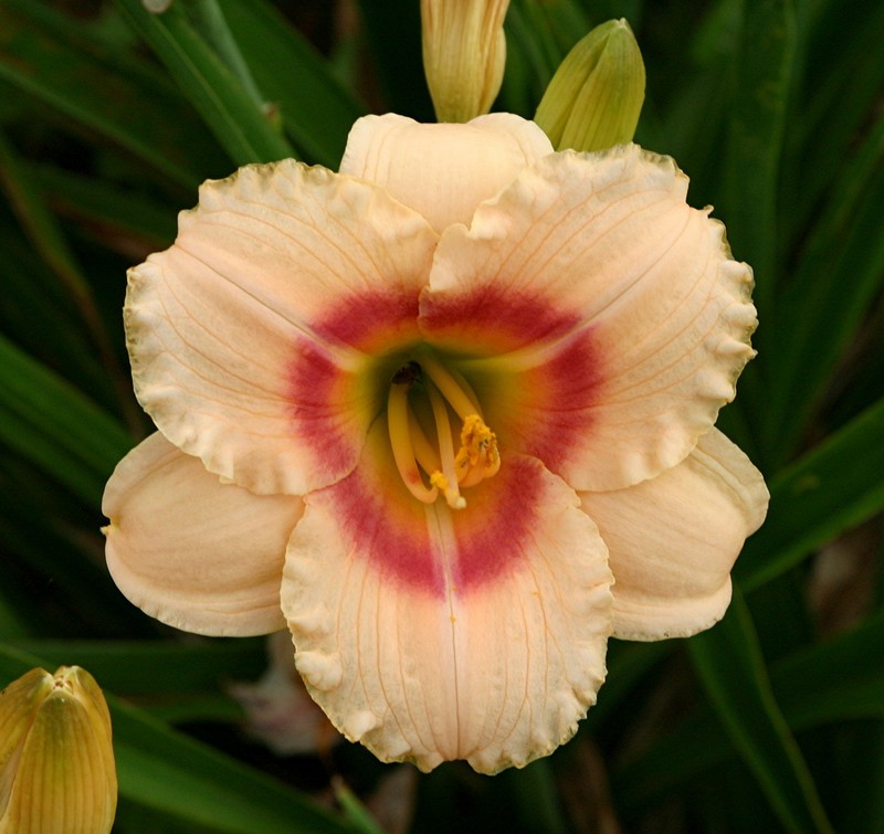 Ніжний, кремово-рожевий із рубіновим оком та зеленуватим горлом. Тривале цвітіння. Рекомендується висаджувати на сонячних місцях без застою води.