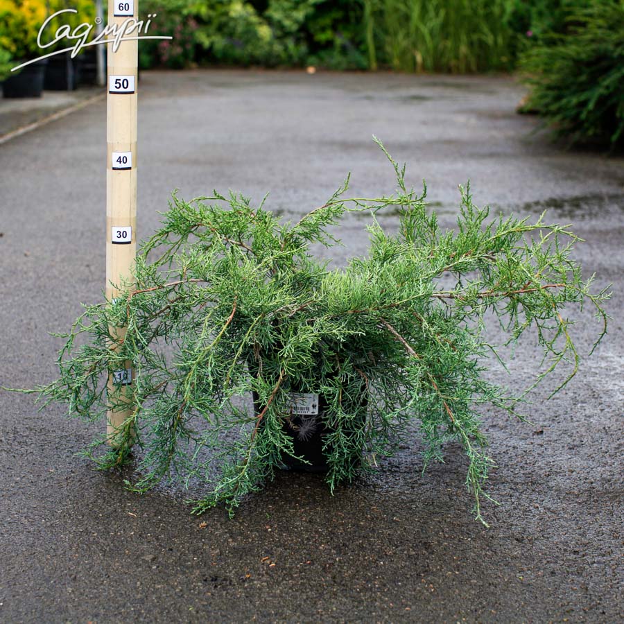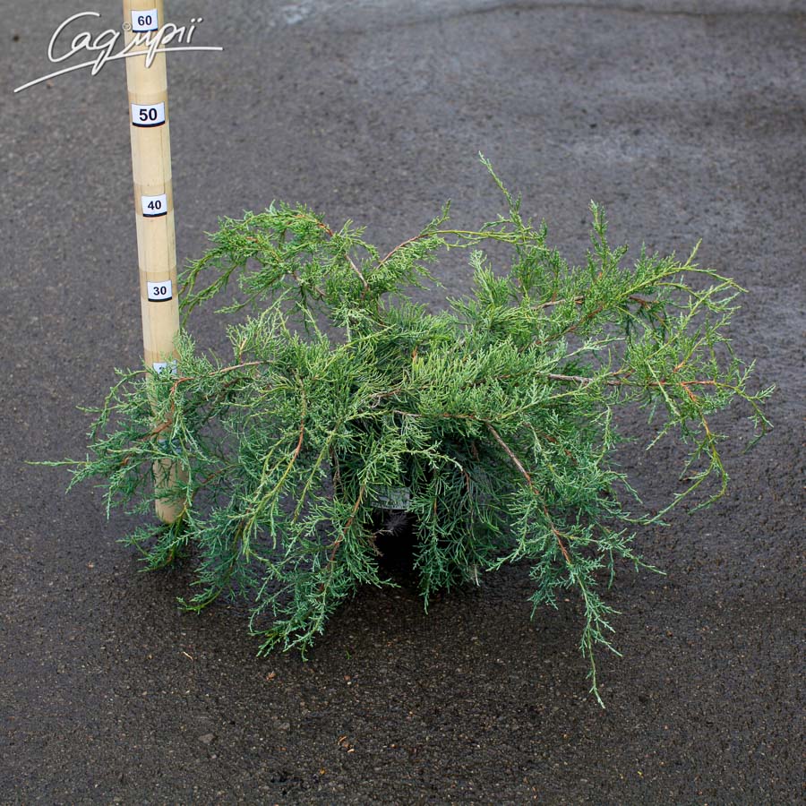 Хвойний чагарник з розлогою кроною. Досягає висоти 0,5 м, ширини 2,5 м. Хвоя утворює щільні куртини, з яких виступають тонкі молоді пагони. Хвоя блакитно-срібляста, має лускату структуру, не колюча. Віддає перевагу сонячним місцям або напівтіны. Добре росте на дренованих вологих супісках. Застосовується поодиноко і в групах в рокаріях, альпінаріях, для посадки в контейнерах.