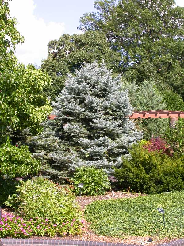 Вечнозелёное дерево с плотной, широкопирамидальной, симметричной, кроной. Ветви жесткие, отрастают под прямым углом от ствола, образуют правильные ярусы. Кора коричнево-серая шелушащаяся. Крона очень густая. Хвоя насыщенно голубая, игольчатая, жесткая, острая, длиной 2-3 см. Шишки в молодости зеленоватые, со временем светло-коричневые. Быстрорастущее растение. Достигает высоты 10 -15 м. и ширины 3 -4,5 м. Годовой прирост в высоту 20 - 40 см., в ширину - до 20 см. Светлолюбива, почвы предпочитает плодородные, умеренно увлажненные, дренированные, слабокислые. Используется в качестве солитерного растения, в групповых посадках, для создания аллей, живых изгородей.