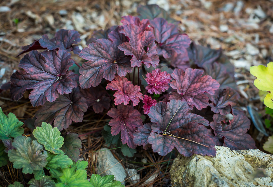 Полив - умеренный. В первый сезон - регулярный, в дальнейшем - в засуху. Поливайте под корень, избегая заливания центра розетки. Гейхера лучше переносит кратковременное подсушивание, чем переувлажнение. Подкормка: весной внесите компост или небольшую дозу комплексного удобрения. При необходимости в середине лета можно повторить легкую подкормку, но без избытка азота, чтобы растение не «жировало» и не теряло насыщенность цвета. Мульчирование: слой 3–5 см помогает поддерживать стабильную влажность, уменьшает перегрев корней и препятствует размыванию почвы. Раз в 3–4 года куст желательно разделить, делать это лучше весной или в конце лета. Это поддерживает плотность розетки и стимулирует появление молодых, ярких листьев..