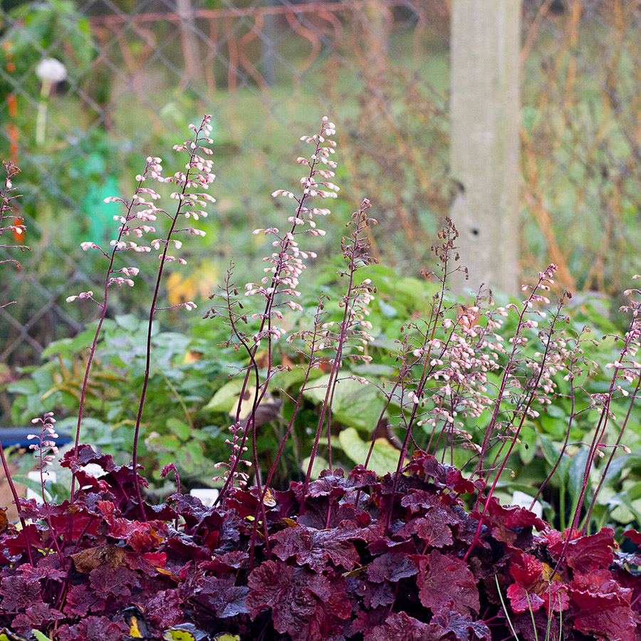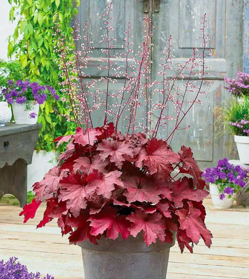Гейхера ‘Cajun Fire’ — яркое декоративно-лиственное многолетнее растение, формирующее плотную розетку из крупных волнистых листьев насыщенных теплых оттенков. Молодые листья часто имеют огненно-красный или медно-оранжевый тон, со временем переходящий в глубокие бордово-красные и шоколадные нюансы, а нижняя сторона листа нередко остается пурпурной. Благодаря такой «пылающей» палитре ‘Cajun Fire’ работает как сильный акцент в тени и полутени, прекрасно сочетается с хостами, папоротниками, астильбами, бруннерами, гейхерелами, декоративными злаками и хвойными. Подходит для миксбордеров, бордюров, контейнеров и озеленения под кронами деревьев. Куст компактный, аккуратный, в среднем 25–35 см в высоту (листья) и 30–45 см в ширину. В период цветения над розеткой поднимаются тонкие цветоносы до 45–60 см, с мелкими колокольчатыми цветками (окраска зависит от условий, чаще кремовая или светло-розовая). Основная ценность сорта — декоративная листва, которая сохраняет привлекательность с весны до поздней осени, а при мягких зимах может частично оставаться зеленой. ‘Cajun Fire’ придает композициям глубину цвета и «тепло», особенно в тенистых уголках сада, где ярких красок обычно не хватает.