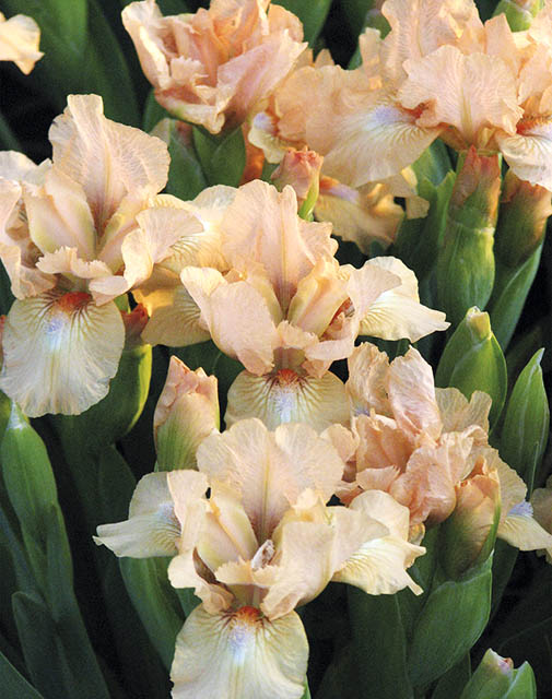 Широкий лососево-розовый с белым пятном вокруг лавандовой бородки. Цветение раннее.