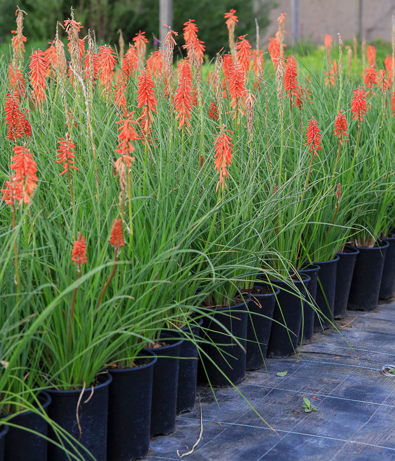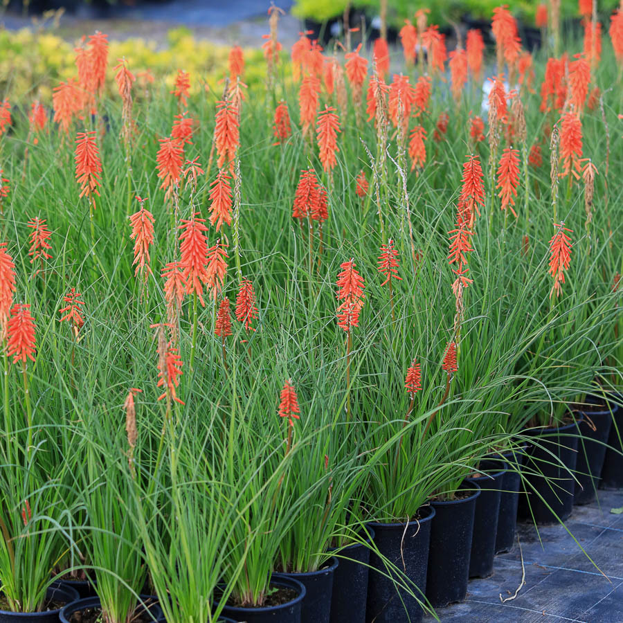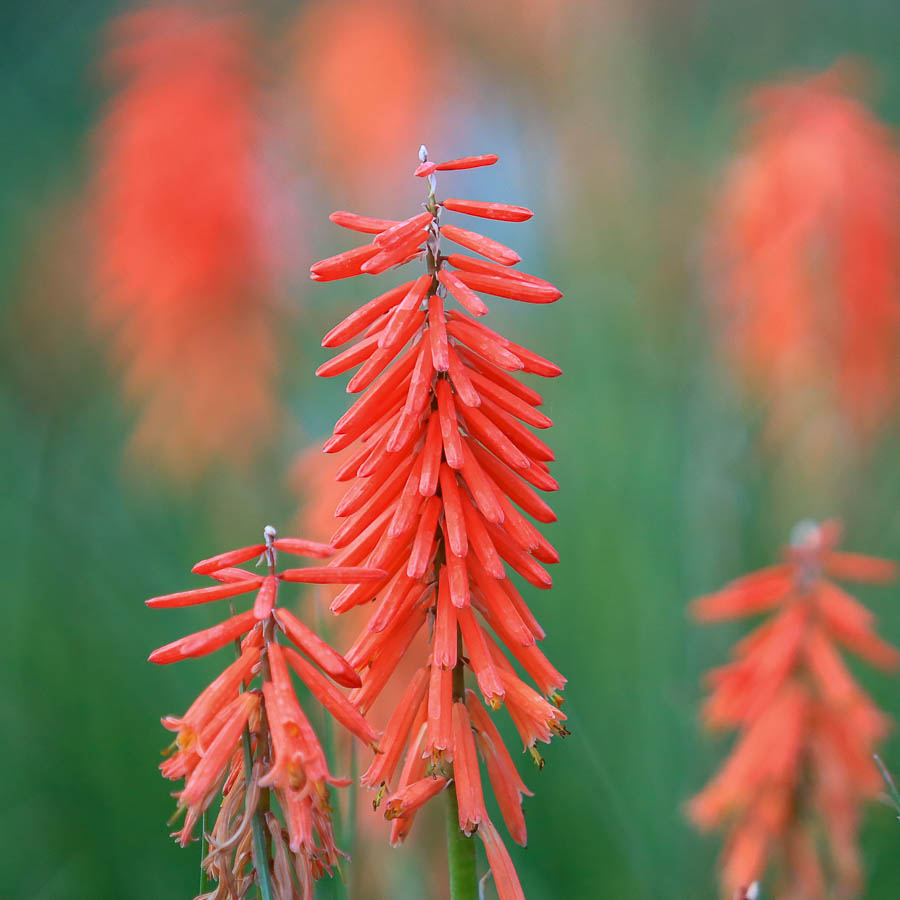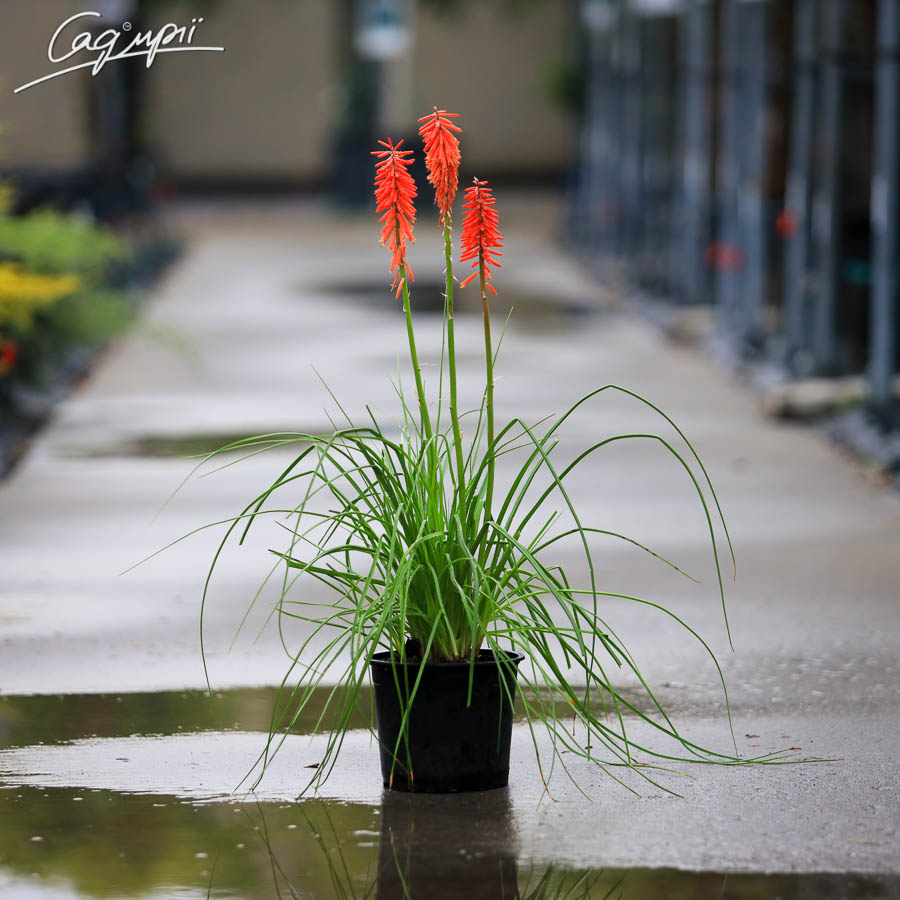 Книфофия ‘Red Rocket’ - экзотическое травянистое растение, широко используемое в ландшафтном дизайне, благодаря своим необычным цветам на прямых цветоносах располагаются трубчатые бутоны, которые раскрываются постепенно - снизу вверх. Соцветие - в виде факела, низ – светло-желтый, а к верху цвет меняется на ярко-красный, но между верхом и низом идет плавный переход цветов. Высота соцветия до 25см, а высота цветоноса - до 1м. Сам кустик образует небольшую розетку из узких, длинных, зеленых листьев. Цветение наступает в июле и длится до заморозков. Нужно только удалять отцветшие цветоносы.