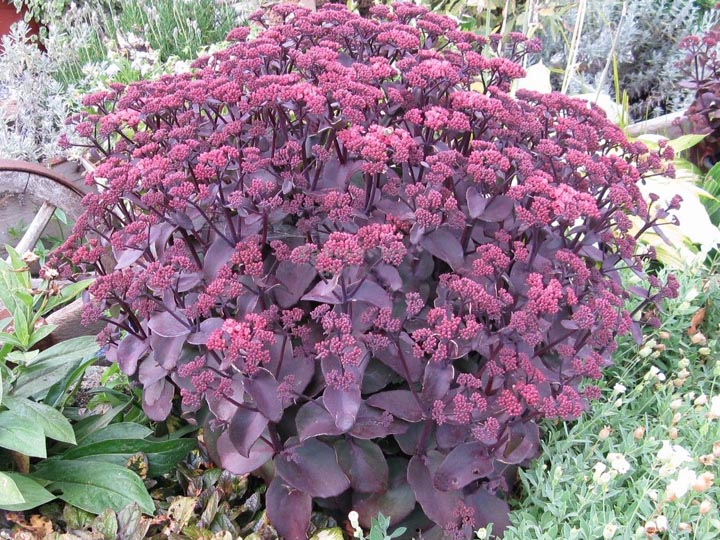 Эффектное декоративное растение высотой до 50 см. с темной, глянцевой листвой. Плотный восковой налет придает пурпурно-фиолетовым листьям голубоватый оттенок. Цветение обильное, с июля и до осени. Ближе к осени розовые соцветия постепенно темнеют. Предпочитает солнечные места, к почвам не требователен, однако желательно избегать кислых почв. Не выносит переувлажнения. Применяется для каменистых садов, миксбордеров, рокариев, альпийских горок.