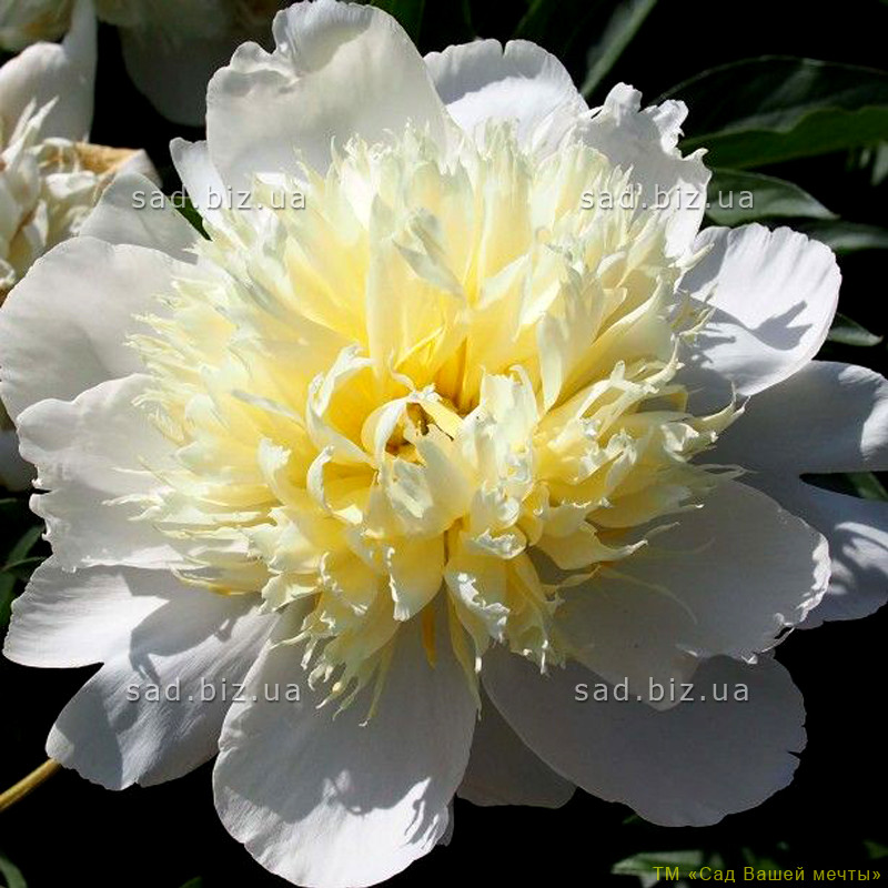 Пион травянистый 'Primevere' – нежный сорт пионов, высота до 90см. С крупными шаровидными махровыми цветами белого цвета с желтой серединой, очень эффектно выглядят. Цветы диаметром 16см. Обладает очень приятным ароматом. Зацветает в середине июня, цветение непродолжительное: 8-10 дней. Листья темно–зеленые, резные.